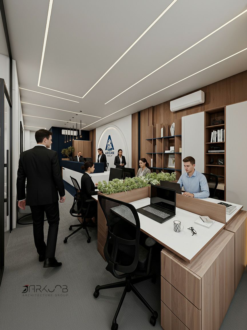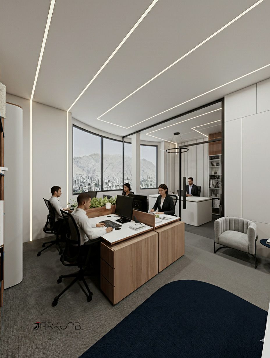 خطوط مینیمال و سقف پویا: طراحی مینیمال سقف و استفاده از خطوط تمیز و ساده، به فضا عمق بخشید و حس وسعت و نظم را تقویت کرد. این طراحی در پروژههای اداری مدرن، نقشی کلیدی در افزایش تمرکز دارد.