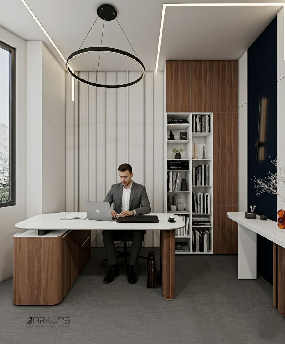استفاده از متریال گرم: چوب و متریالهای با بافت گرم در کنار رنگ سرد سرمهای، تعادلی دلنشین و صمیمی ایجاد کردند و فضا را از خشکی و بیروحی دفاتر کلاسیک دور ساختند.