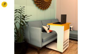 این میز اداری با صفحه کشویی که ویژگیهای خاص خود را دارد، فضای کمتری را اشغال میکند و از همه مهمتر، کاربر نیازی به خم شدن به سمت میز ندارد که این امر فشار را از روی کمر و گردن او برمیدارد. علاوه بر صفحه کشویی، در بخش پایه میز نیز فضایی برای قرار دادن پا طراحی شده است تا از آویزان شدن پا جلوگیری شود.