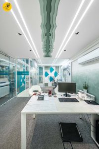 شیشه‌های دودی، سفید و فلوت به کار رفته در این پارتیشن‌ها، نه تنها زیبایی و جذابیت بصری را افزایش می‌دهند، بلکه به کنترل نور و حریم خصوصی نیز کمک می‌کنند. شیشه دودی به طور خاص برای فضاهایی که نیاز به کاهش تابش نور دارند، مناسب است. از طرفی، شیشه سفید جلوه‌ای روشن و دلنشین به محیط می‌بخشد و شیشه فلوت با سطح صاف و شفاف خود، نمایی مدرن و شیک را فراهم می‌کند.